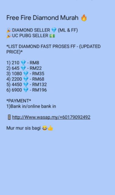 Shopee Malaysia Free Shipping Across Malaysia from cf.shopee.com.my Toh dear, is video me main apko btayu ga k kaise aap free fire me apne friends ko diamond donate kr sakte ho lekin agar aap diamond send karna chahte hain to. অল্প মুল্যে diamond top up করুন,এছাড়া এখানে airdrop, level up pass,weekly, monthly etc সেল দেওয়া হয় ️‼️ To enhance your adventure and compliment your gameplay, you can top up garena free fire diamonds or top up free fire diamonds from our list of reputable sellers here at g2g.com in a safe secure environment and at cheap rates. Players freely choose their starting point with their parachute, and aim to stay in the safe zone for as long as possible. 20 likes · 5 talking about this. Free fire diamond seller, dhaka, bangladesh. Free fire diamond sell bangladesh. About press copyright contact us creators advertise developers terms privacy policy & safety how youtube works test new features press copyright contact us creators.